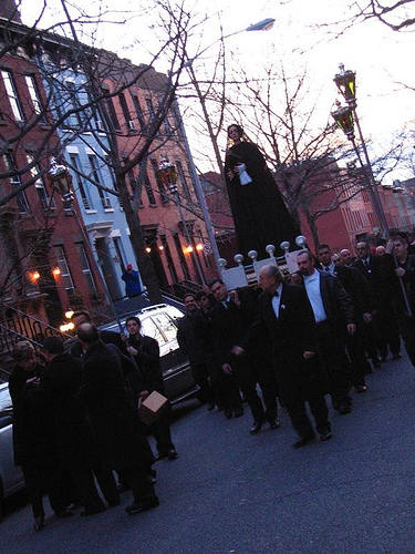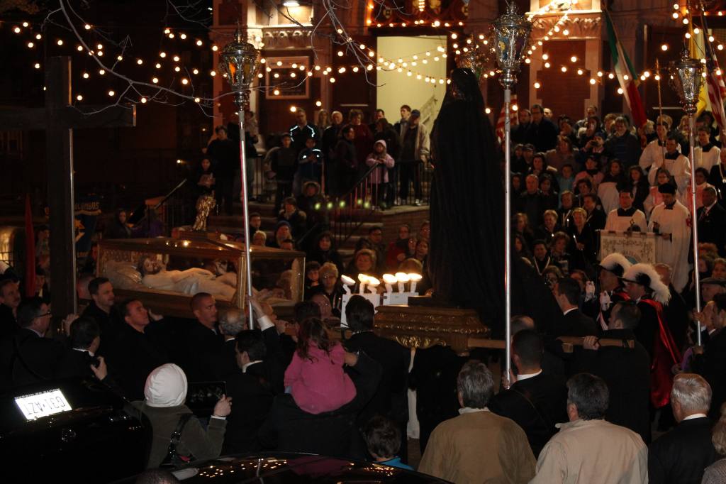 Good Friday is the day in which Catholics believe Jesus Christ suffered and was Crucified for the sins of Humanity. The Good Friday Procession, which has its roots in the small towns of Italy, recalls the passion of Jesus Christ by way of Symbolic statuary representing Jesus and Mary, traditional Italian hymns, a traditional Italian funeral band, and processing men, women and children who re-enact the last steps of Christ to his tomb, by candlelight . |